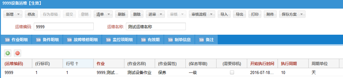 設(shè)備作業(yè)計(jì)劃涉及設(shè)備停機(jī),管理員在后臺(tái)管理系統(tǒng)中能自動(dòng)將需要進(jìn)行維護(hù)作業(yè)的所有設(shè)備在檢修計(jì)劃中顯示。在檢修計(jì)劃中柔性地安排各設(shè)備作業(yè)計(jì)劃,合理地將需要停機(jī)檢修的設(shè)備統(tǒng)一安排成新的檢修計(jì)劃。檢修計(jì)劃的設(shè)備作業(yè)將自動(dòng)覆蓋原先作業(yè)計(jì)劃的設(shè)備作業(yè),避免造成同一周期內(nèi)同一設(shè)備重復(fù)同樣的作業(yè)計(jì)劃。并且一個(gè)檢修計(jì)劃內(nèi)未完成的任務(wù)可以納入到下一次的停機(jī)檢修計(jì)劃中去。系統(tǒng)確保所有計(jì)劃井井有條的進(jìn)行。檢修計(jì)劃實(shí)時(shí)顯示設(shè)備作業(yè)計(jì)劃進(jìn)度。此步驟非必要步驟,可按實(shí)際需求進(jìn)行選擇性操作。